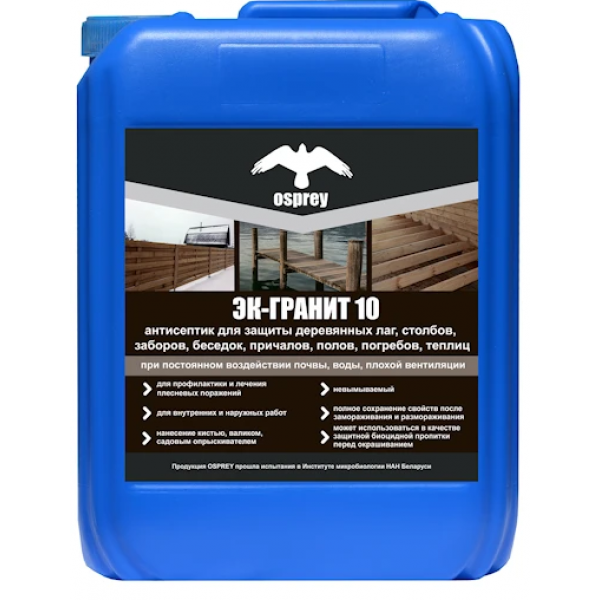 Антисептик «ЭК-Гранит 10» хранят в герметичной таре в закрытых складских помещениях, отдельно от пищевых продуктов. Гарантийный срок хранения раствора — 1 год с даты изготовления.