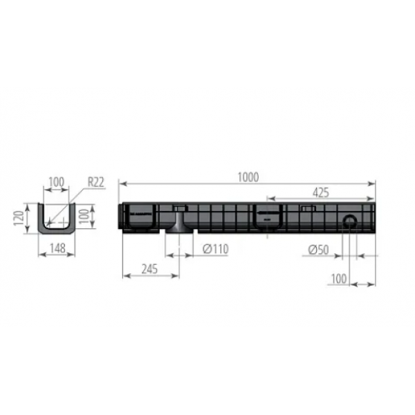 Лоток водоотводный пластиковый ЛВП Norma 100 Н120 Применяется для многоуровневых паркингов, частных домовладений, пешеходных и проезжих зон , для оборудования эксплуатируемых кровель. Класс нагрузки А15 В125 С250.